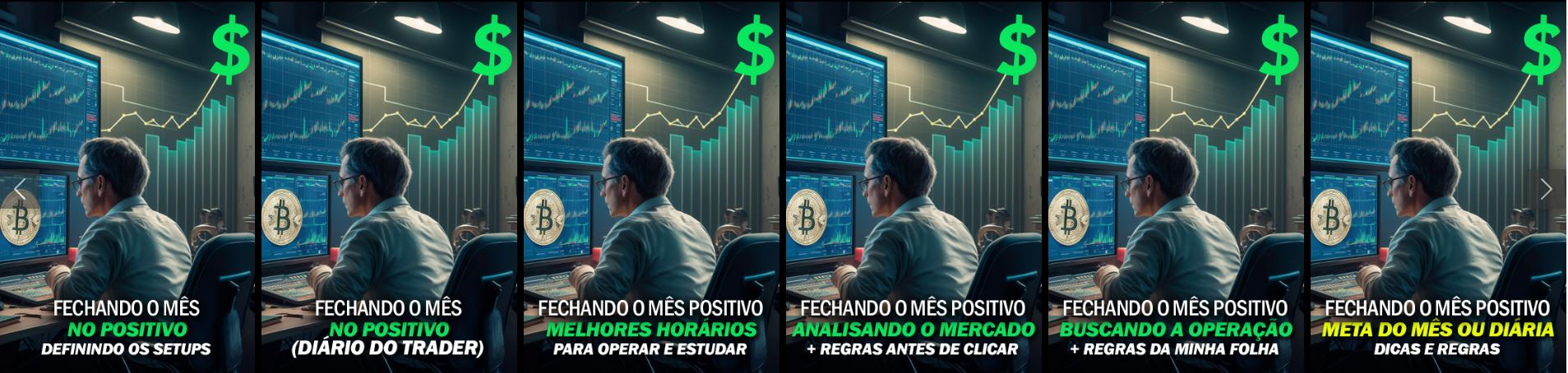 Esse módulo mostra, de forma completa, todas as minhas rotinas diárias no mercado. Nele, compartilho em detalhes os setups que utilizo, como aplico meu gerenciamento de risco e as estratégias que sigo no dia a dia para manter a consistência. Também mostro o que faço quando atinjo minha meta mensal — desde como ajusto o foco, até as decisões que tomo para proteger o lucro e evitar operações desnecessárias. É um módulo prático, onde abro meus bastidores e explico passo a passo como mantenho a disciplina e o controle emocional, mesmo diante das oscilações do mercado.